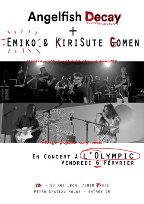 26 janvier 2015Nouveau concert le 6 févrierà L'OLYMPIQUE CAFE20 rue Léon Paris 18 émeavec, en 1ère partie de soirée EMIKO & KIRISUTE GOMEN S'il est encore nécessaire de la présenter, Emiko est une musicienne multidisciplinaire jouant au coeur de la scène parisienne depuis 15 ans.Elle collabore, principalement à la batterie, aux percussions et au chant, avec des formations venant de cultures musicales très variées, notamment avec Fantazio, Les Elles, Urban Sax, Rihanna, BrainDamage, Otomo Yoshihide, Noel Akchote, Ensemble Sakura, Don Cavalli... Au sein du mami ChanBand et d'Idiots elle collabore entre autres avec Olivier Deparis, l'initiateur et compositeur d'Angelfish decay.En 2011, elle décide de monter son propre groupe, où elle se concentre presque exclusivement sur le chant : Emiko & KiriSute Gomen. Elle veut en faire un « minyo psyche surf rock band ». Il s'agit,tout en témoignant d'un profond respect pour les minyo interprétés (musique traditionnelle populaire japonaise), de s'en approprier les composantes profondes, et de les confronter à la musique actuelle occidentale. La déclinaison en duo du groupe est présentée par Emiko Ota (chant, batterie, taiko) et Julien Omeyer (guitare, basse, biwa, chant).