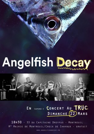 En décembre 2013, lors de 2 show cases dans une petite salle parisienne, Angelfish decay jouait pour la 1° fois ses titres en public. Cet essuyage de plâtre marquait une étape importante dans la progression de notre travail, après de longs mois de préparation, écriture, répétitions.
